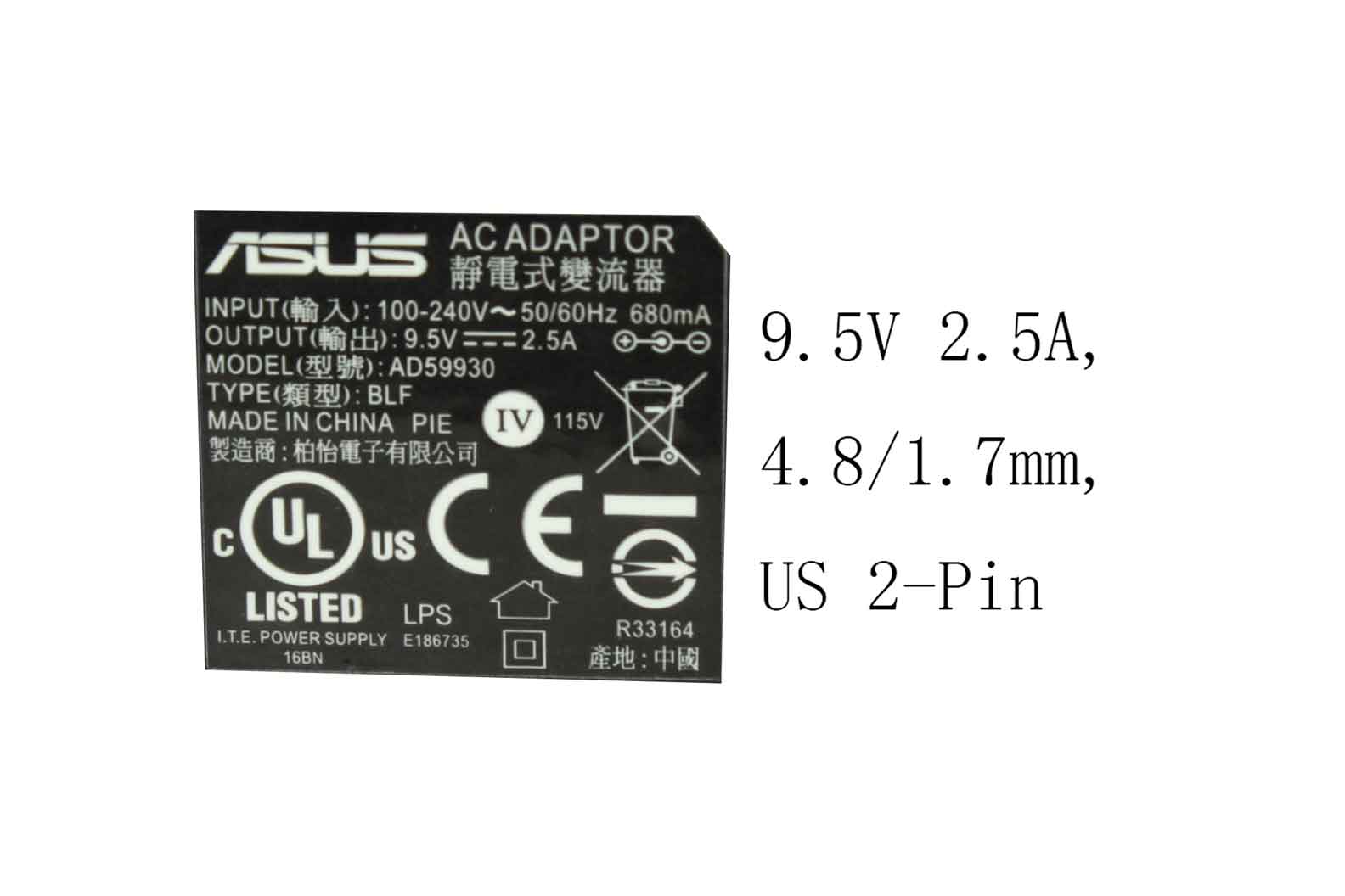 9.5V 2.5A, 4.8/1.7mm, US 2-Pin
