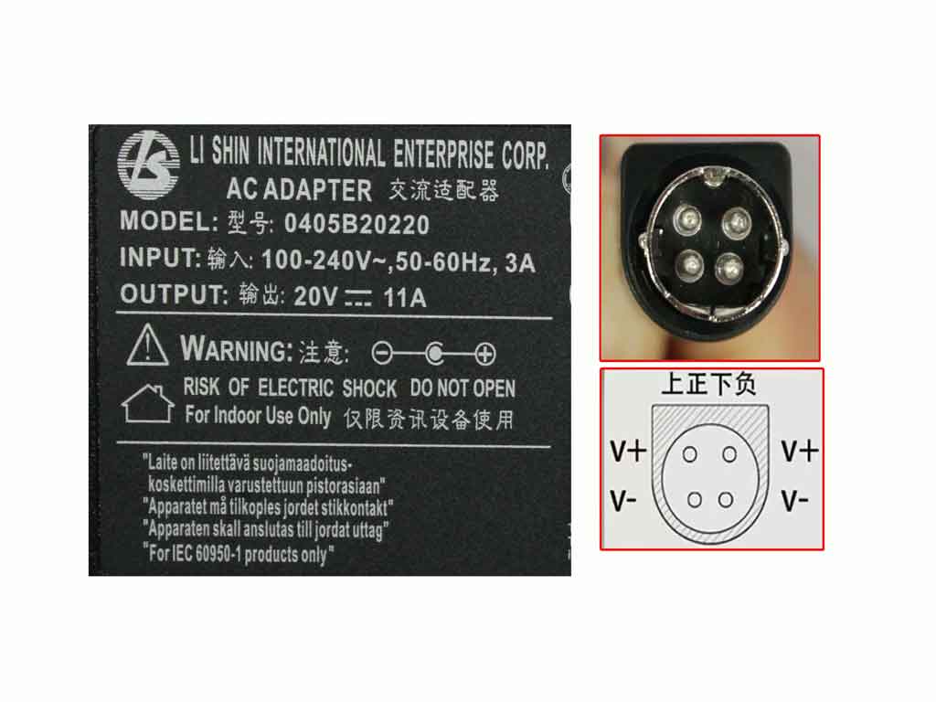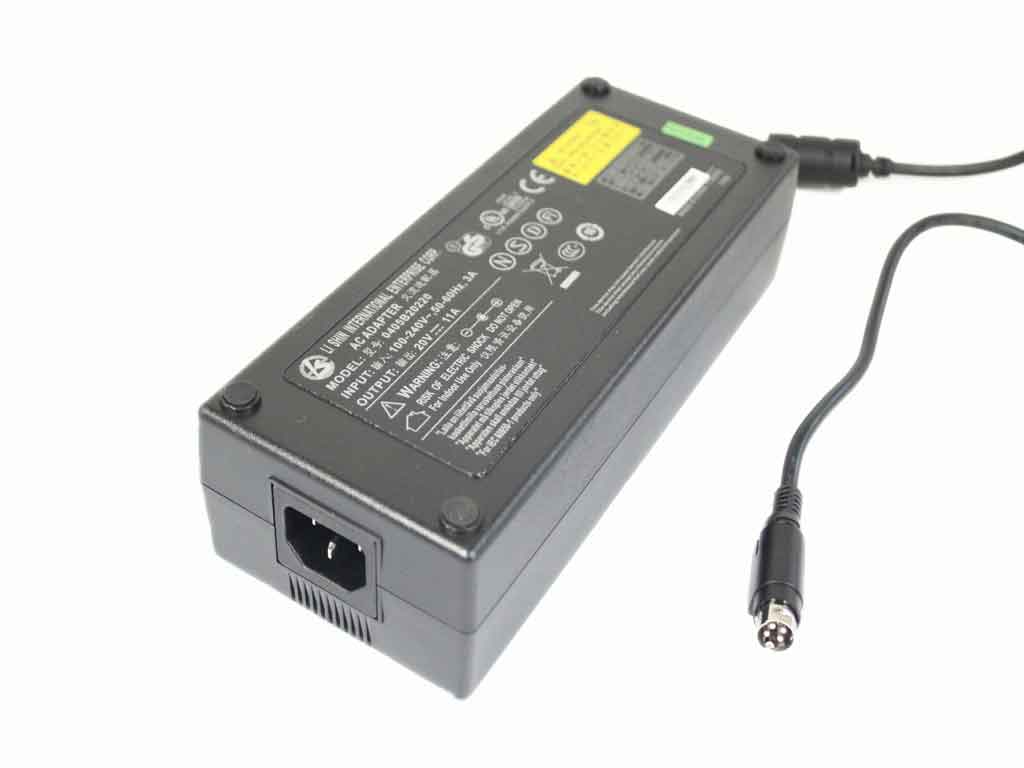 AC Adapter Model: 0405B20220 INPUT: 100-240V~ 3A, 50-60Hz OUTPUT: 20V 11A 220W Connector: 4-pin DIN Dimensions: 168 x 65 x 38 mm *Please take note, IEC AC power cord not included.